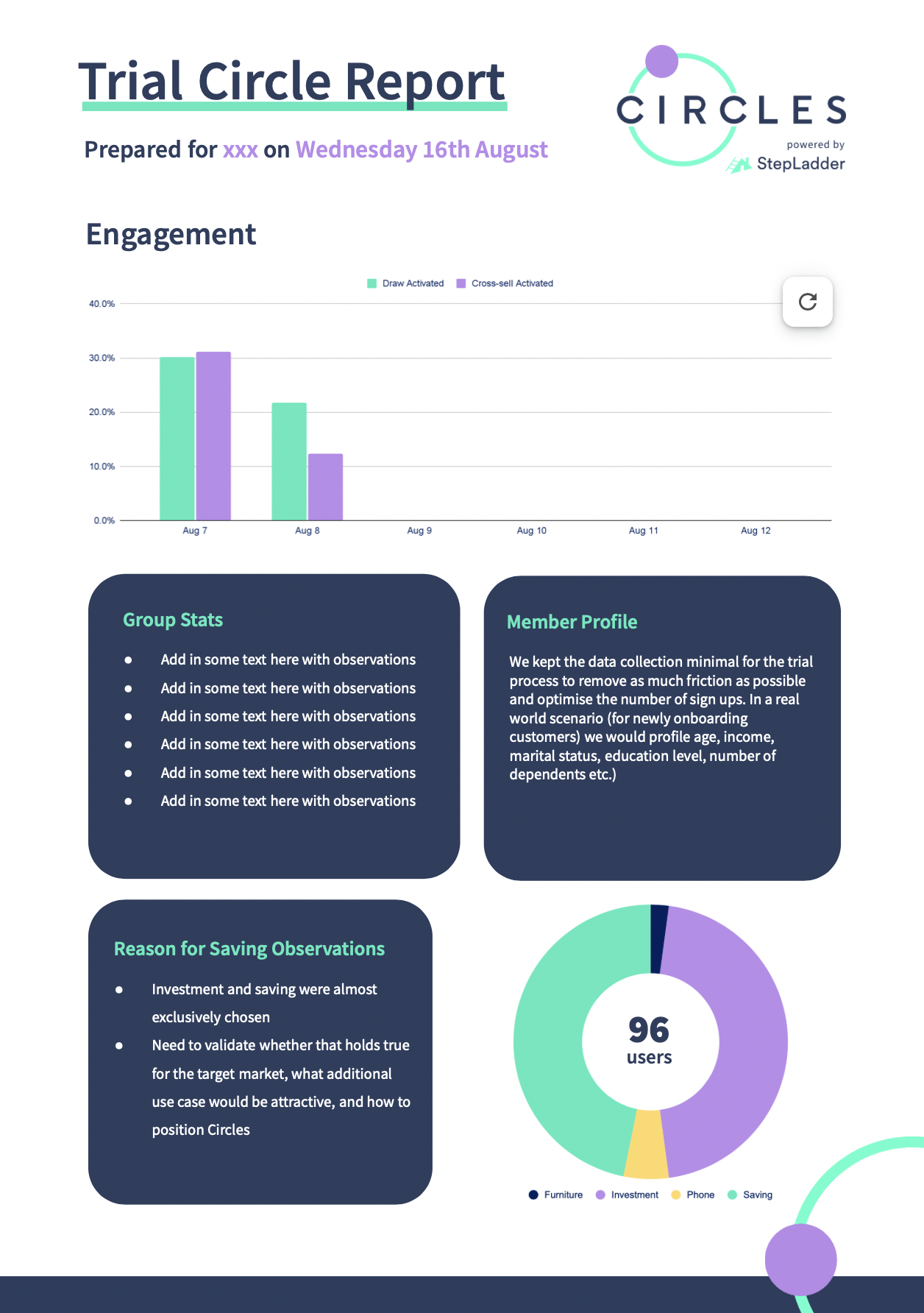There will be a Draw every day for one week. Automated emails will direct participants to check their Circle status in the platform, which will also be pre-loaded with offers to match the reason for saving.